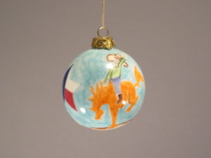 Christmas bulb #3 with a Cowboy riding a bucking Orange Horse, a Lucky Horse Shoe, the Star of Texas and Purple Bull Skull. 3 1/2″ in diameter.